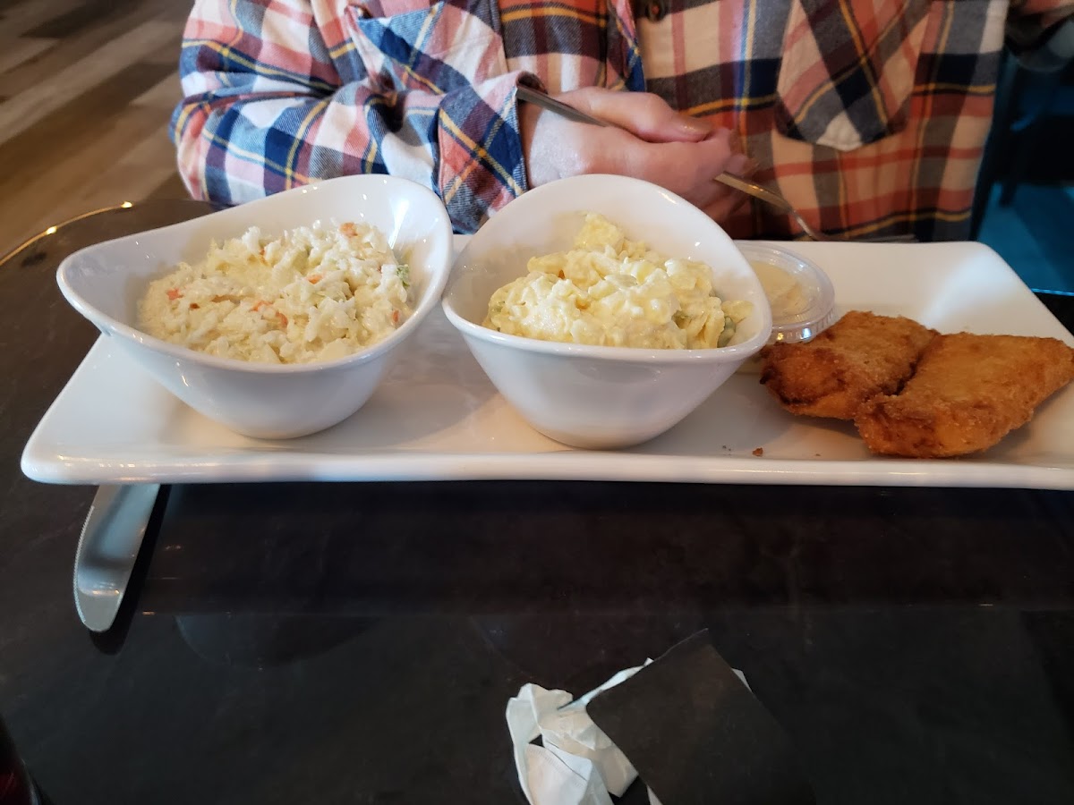 First visit to this establishment. Very clean, modern, and well decorated. Nice touch with old pictures of artists who have played at Buck Lake Ranch. The food was excellent, and side selections are not just fries and cole slaw. I got garlic mashed potatoes and brussel sprouts. The brussel sprouts were excellent with bacon bits sprinlked on and had a touch of sweetness. The garlic mashed potatoes tasted like instant potatoes made with water. Very little flavor and not creamy. I had the fish dinner, and it was great. Lightly breaded and flakey.